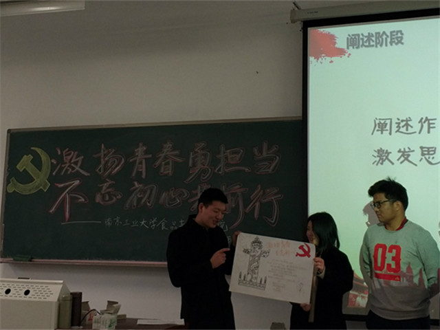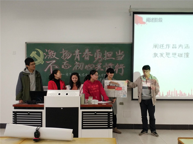 首先由黄政瑜对活动主题进行简要的解说。之后以党员2人、非党员2-4人一组的形式,围绕“激扬青春勇担当,不忘初心共前行”主题进行发散性思维的绘画或者手抄报。张晨怡和蒲雅婕小组通过绘画来诠释“青春的风浪”,以此来表达自己正值青春,应当勇于担当,发挥才干。吴天祺与陈心怡小组则绘出一张手抄报,以此来展示习总书记关于青春、关于初心的重要讲话。谷世明和朱银洁小组联系华表的图文构型及其内涵对“不忘初心”进行了解读,张晓康和吴越琪小组也展示了他们心目中的十九大与我们的活动主题,强调了绿水青山的重要性,其余小组也对自己的作品进行了解说。最后黄政瑜同志对本次活动做了点评总结,认为各组作品主题鲜明有内涵,想象力非常丰富,希望大家能从中学习,加强对党的认识,将“激扬青春勇担当,不忘初心共前进”变成心目中的指路标。