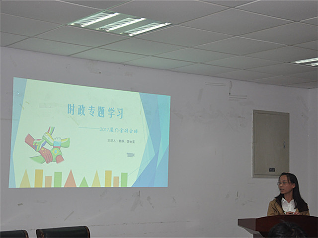 接着是韩静和魏金星以“2017厦门金砖会晤”为主题介绍了金砖会晤的内容。韩静通过播放“金砖会晤”视频带领大家了解金砖会晤的主要内容,并介绍了金砖五国黄金十年的发展变化,然后带领我们学习了金砖五国为谋求共同发展所展现出“志合者,不以山海为远”的决心以及习近平总书记在金砖会晤上的重要讲话的内容。然后由魏金星详细讲解了金砖五国的特色以及其在世界上的影响力,并通过一个小视频介绍了“金砖”的由来,然后就“金砖五国如何实现共同发展和合作”这一问题让大家进行讨论。