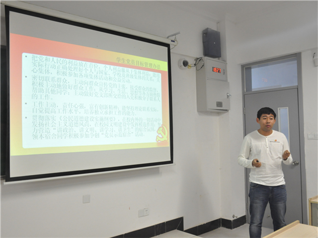 实践教育一开始,党员同志们为积极分子认真讲解了《学生党员目标管理办法》和《学生党员纪律管理办法》,从自己和身边的事例讲起,每一条办法都用详细的案例加以解释,并结合自身经验,引导入党积极分子树立良好的价值观念。随后,党员同志们为积极分子播放了《永远在路上——把纪律挺在前面》的精彩视频,告诫每一个入党积极分子:对于一个党员,党的纪律就是高压线;对于一个政党,纪律就是生命线。最后,所有积极分子围绕“对党员的认识”、“如何正确用党员标准对照自己”等话题先后进行发言。