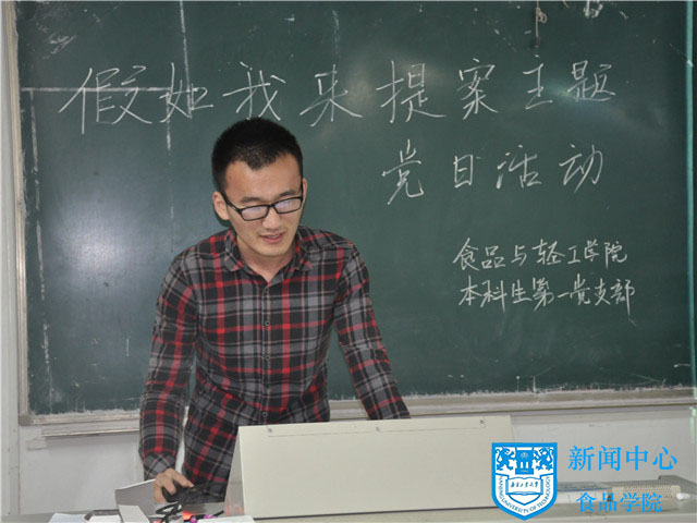 5月11日晚六点半,本科生第一党支部全体党员与积极分子早早来到厚学103教室参加党日活动的最后一个环节--议案PPT展示及现场记者提问。由各小组作为代表团进行议案PPT展示并回答由积极分子扮演的现场记者针对提案提出的问题。第一代表队代表付明教同志从2014年就业形势入手,针对大学生就业难的问题进行提案:建立大学生就业失业保障机制,消除大学生就业后顾之忧。然后,第二代表队代表王岩同志就食品安全问题进行展示。他带领大家回顾了2012年至2013年的食品安全大事件,随后与大家深入探讨如何保障食品安全,紧接着又解读了2014年全国两会中有关食品安全的要点。最后,第三代表队以教育改革为主题,从期待孩子心灵更美、体质更健康,实现起点的公平,让教育不再成为乌托邦三个方面阐述了当前社会上呈现的问题,同时也提出了教育改革的重要性与必要性。