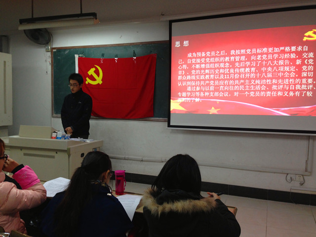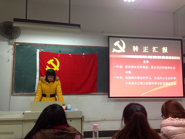 晚上6点,会议准时开始。六位预备党员依次上台进行他们的转正PPT展示。PPT的内容大致包含了六位预备党员在一年预备期间对于入党之初群众向其提出的个人不足的认识和改进,以及在其学习、生活、工作等方面的进步。PPT展示的最后,他们也都向党组织表明了热切希望早日成为一名中共正式党员的决心。PPT展示后即进入答辩环节,该环节分为填空、问答及时事材料分析三个部分。在填空和问答环节,会前准备充分的六名预备党员对正式党员组成的评委团所提出的有关党的理论知识的问题应答如流,论述时也都侃侃而谈,各有见地。时事材料分析涉及社会、经济、体育等各个方面,六位预备党员也都能透过材料事件结合所学理论知识和时下改革动向进行分析,使台下观众受益匪浅,每每掌声如雷。