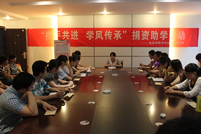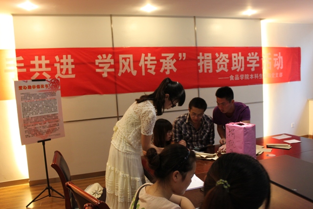 2013年6月16日,美高梅mgm1888公司官网本科生第四党支部发起的“携手共进,学风传承”捐资助学的活动正式进入最后的捐赠环节。此次活动在生工楼A2-209会议室进行,参加人员为支部所有党员、银杏基金代表刘超以及各年级各班的捐赠代表。