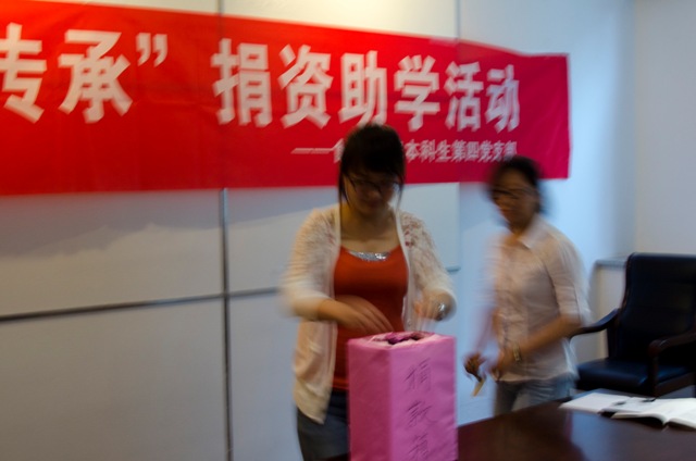 首先由黄少娟同志向与会同志介绍了受捐赠人雍倩的基本情况以及代理捐款机构银杏基金会的基本背景。听完雍倩同学艰苦的求学经历后,与会党员都受到不小的触动,纷纷向前依次在捐款箱中奉献出自己的一份爱心,大家都希望能够进尽自己的绵薄之力帮助她继续完成学业。随后在所有同志的监督下,支部代表沈亚红同志和银杏基金代表刘超清点了善款。数目核对正确之后,由支部书记黄少娟同志作为责任人与银杏基金董事长刘超同志签订了捐资委托书。在看到大家的爱心之举后,银杏基金代表刘超同志首先感谢大家的慷慨解囊,并承诺会将所有爱心捐助善款全额送给雍倩同学,帮助她克服生活困难,继续完成学业。