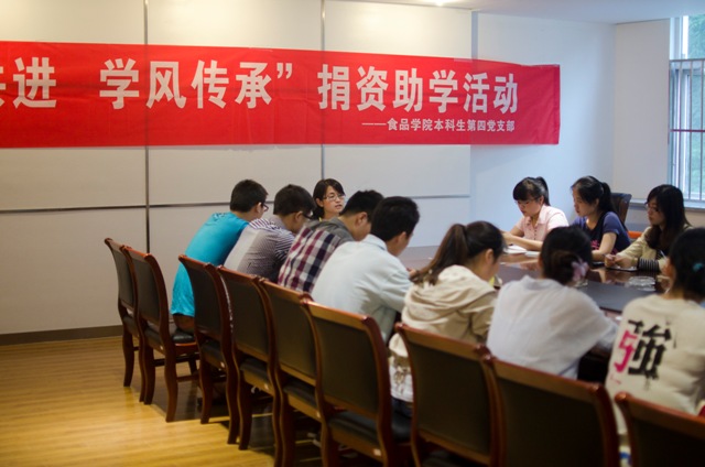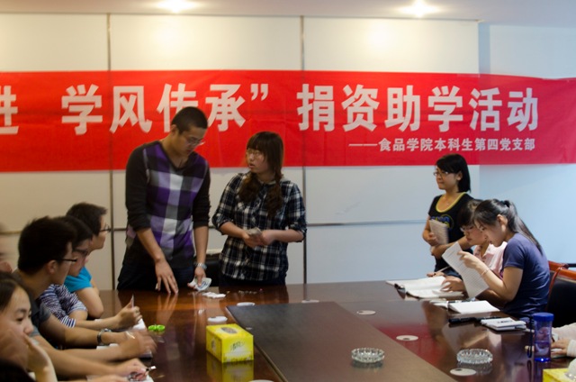 2013年5月29日,美高梅mgm1888公司官网本科生第四党支部在生工学科楼A2-209举办“携手共进、学风传承”爱心捐款的党日活动。活动由支部书记黄少娟同志主持,本科生第四党支部全体成员参与。