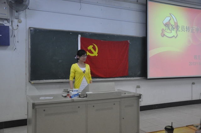 晚上6点半,会议准时开始。首先四位预备党员按其会前抽签顺序依次上台进行他们预先制作的转正答辩PPT展示的环节,PPT的内容大致包含了四位预备党员对于进入党组织之初群众向其提出的个人不足的认识和改进以及预备期间个人学习、生活、工作等方面的进步。PPT的最后,他们也都向党组织表明了其热切地希望早日成为一名中国共产党正式党员的态度和决心。