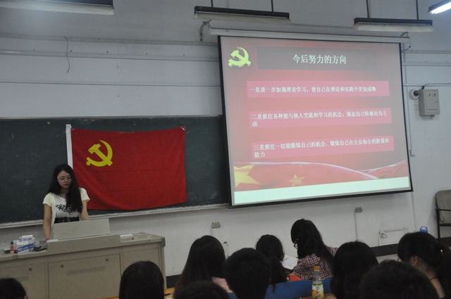 PPT展示后即进入答辩环节,该环节分为简答、论述及时事材料分析三个部分。在简答和论述环节,会前准备充分的四位预备党员对于正式党员们组成的评委团所提问的有关党的理论知识应答如流,针对党的理论知识论述时也都侃侃而谈,很有各自的见地。时事材料分析共涉及到微信收费、“抗日神剧”、雾霾天气和“富士康4天2跳事件”四个方面。程月花同志对于微信收费问题向大家都发表了自己的看法,认为不能单从消费者的角度考虑收费问题,微信之所以收费是因为如果有一半人通过微信来免费发文字信息语音信息,就意味着少一半人拿手机发送短信、彩信,这样就会影响到运营商(也就是移动、联通、电信等)的利益,从这个角度来看微信的收费也是合理的。这个例子也教会了我们今后如何看待时事新闻,不能人云亦云。正如钟秉举同志在提问环节中所提的建议,论述对于一个时事材料的看法时,我们得先做好材料背景的全面认知,然后找到想要论述的点展开个人观点的阐述。陈鹏同志在提到“富士康一线员工承受巨大劳动强度”这一时事话题时,他认为也许是企业生产线的需求量大以及企业运营模式的惯例所导致,但照此发展下去的话将会导致基层崩溃,既伤害了大批员工的生理心理健康,更重要的是破坏了企业形象,导致整个组织恶性循环,既从公司本身也从员工自身进行全面分析,思维清晰。
