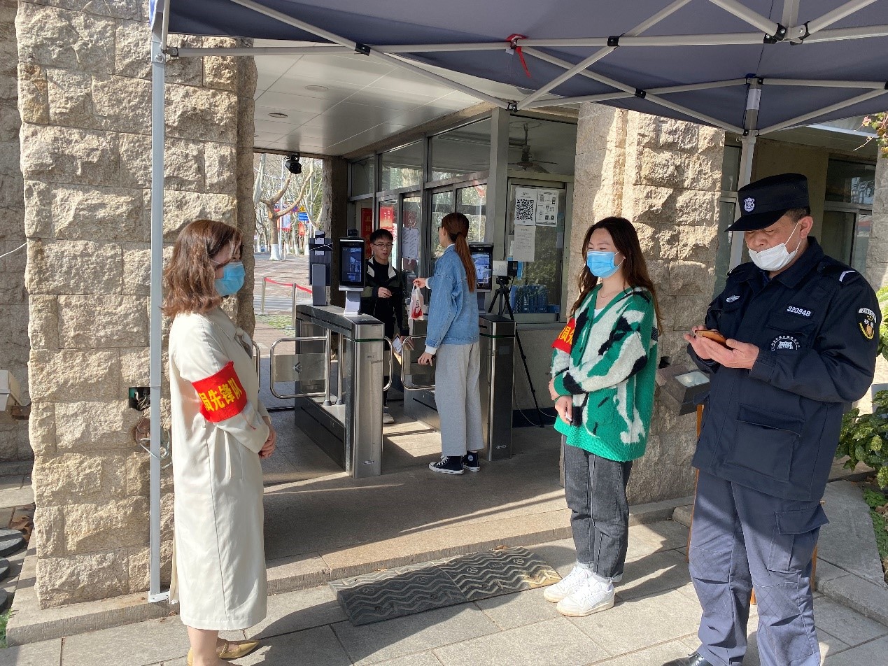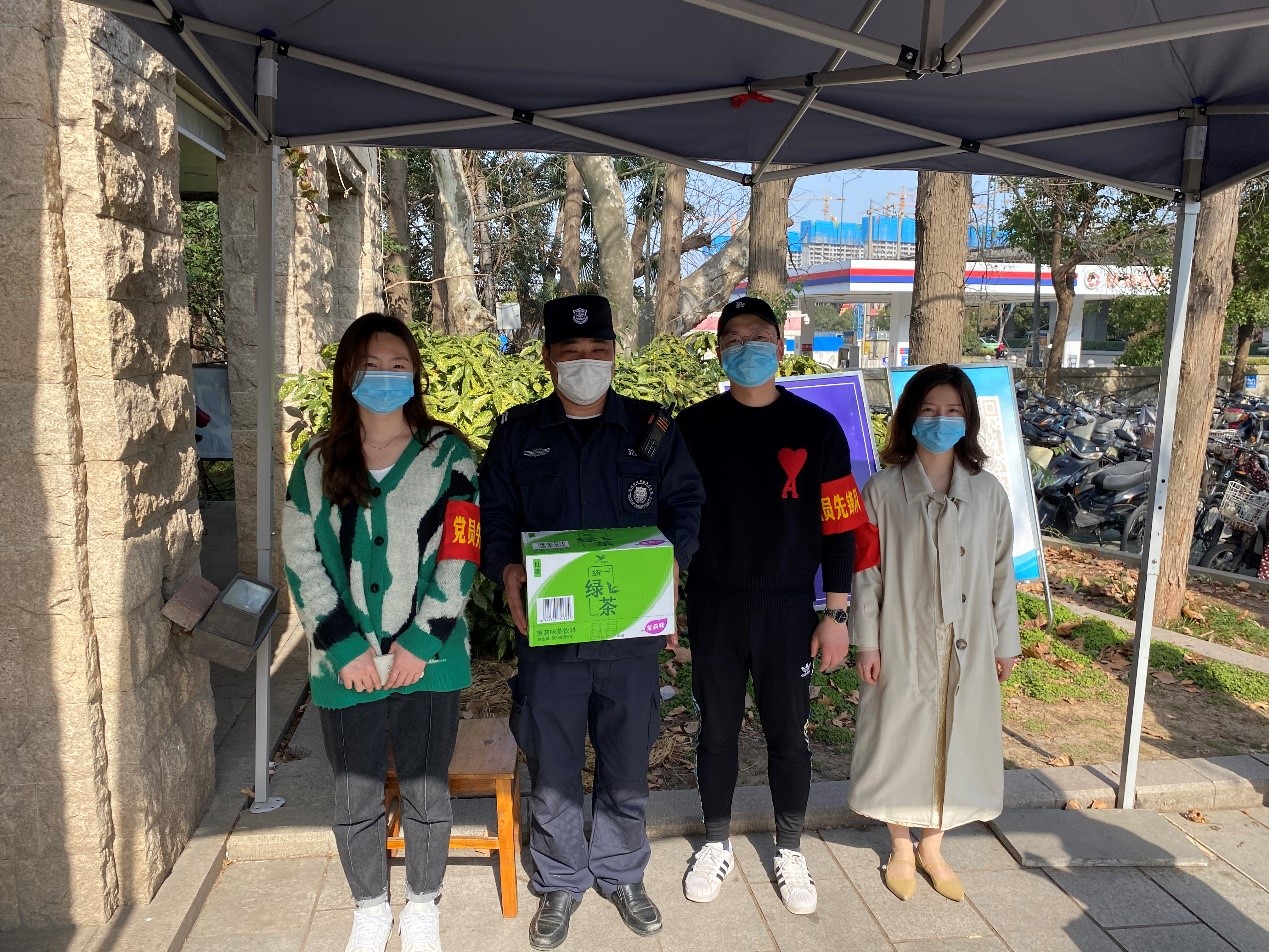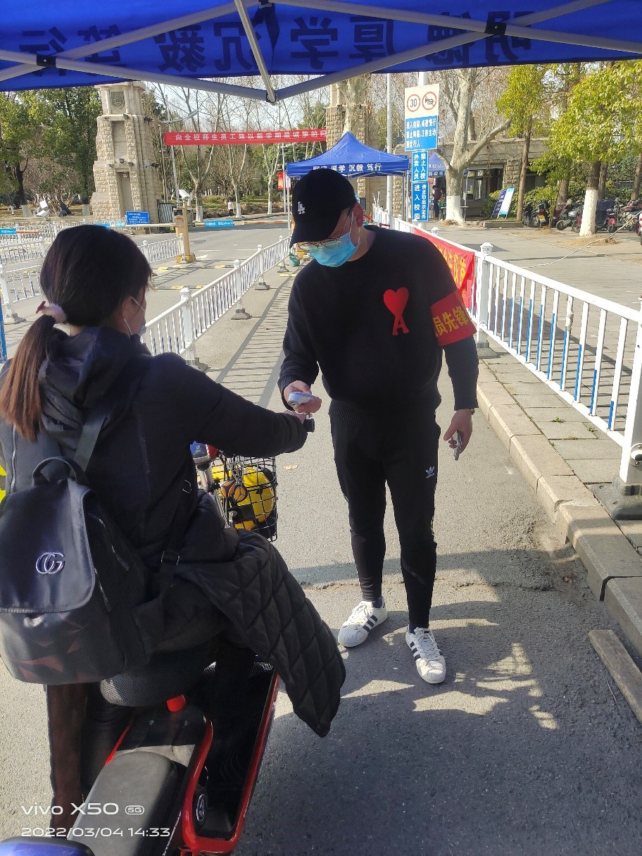 下午1时至3时,支部青年教师党员来到学校东南门入口处,为校园安保人员送水解渴、进行校园防疫站岗志愿服务工作。因近日迎来延迟返校学生入校小高峰,党员同志积极配合安保人员,加入日常进出校园站岗防疫服务工作,同志们仔细逐一检查入校学生的行程码和健康码,辅助做好机动车及非机动车道进出人员体温检测工作全覆盖,对行程码、请销假状态异常者零通过、必劝返,为校园安全做好第一道保障!虽是初春,但两个小时的轮值服务下来,党员志愿者们汗流浃背,深切体会到了安保工作的不易,也对实践雷锋精神又多了一份感悟。