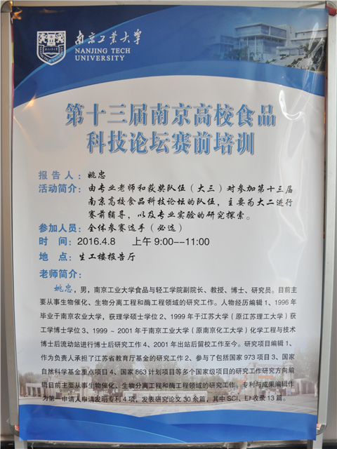 由专业老师和获奖队伍(大三)对参加第十三届南京高校食品科技论坛的队伍,主要为大二进行赛前辅导,以及专业实验的研究探索。