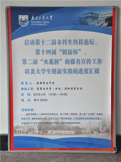 组织开展第十二届本科生科技论坛、第十四届“创新杯、第二届“火花杯”的报名宣传工作,做好活动的介绍,让学生充分了解科研动态,以及培养学生的实际动手能力;并且参加2016年大学生创新实验的同学,进行实验进度的报告。