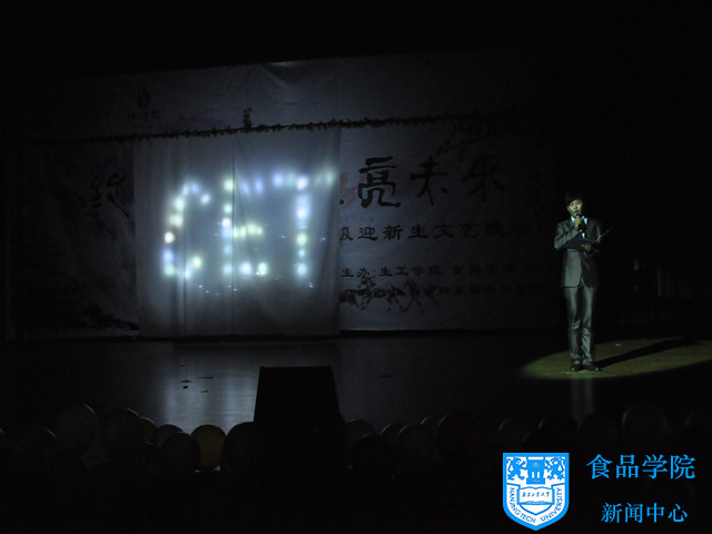 晚上6:30,大礼堂已经是座无虚席了。晚会在热情洋溢的街舞串烧中拉开帷幕,荧光灯下舞者们活力四射的表演感染了现场每个观众。随后主持人宣布了晚会正式开始,并邀请食品院党委书记熊晓辉教授致辞,熊晓辉教授表达了对大一新生的热烈欢迎及衷心祝福。随后的节目中更是精彩连连,高潮不断。晚会的三个组成篇章:舞动青春、韵颂青春、情系未来分别表现出了各自的精彩,赢得了同学们此起彼伏的掌声及欢呼,其中街舞串烧、小品《如此班级》、man show、《光影流年》等节目更是把现场气氛推向一个个高潮……获得好评最多的要属食品院的创意节目《光影流年》了。朗诵者用那富有磁性的嗓音慢慢道出在南工的生活经历,一旁的同学们在幕布后用手电打出亮点组成不同的图案,有声有色,新颖感人,每个图案都是演员用努力和汗水拼接的,这份新鲜,这份诚挚,这份感动,赢得在场观众的一致好评。辅导员王浩老师在晚会结束后还加以称赞说:“《光影流年》这个节目真是没得说,形式加内容,棒!”当然,抽奖活动的丰厚奖品也吸引了不少同学们的目光。集体大合唱《浦珠南路的故事》更是引起了全体同学们的共鸣。晚会在轻松愉悦的氛围中正式结束!