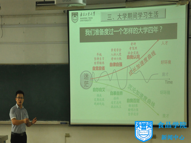 本次讲座的内容主要有三个方面:王健学长对自己的个人介绍,轻化工程专业介绍,以及大学生要如何度过自己的大学生活。王健为了让学生们更加了解轻化专业,简要地讲述了自己毕业后的工作历程,鼓励同学们应该充分利用寒暑假的空余时间,多多寻找实习机会,锻炼自己,积累经验。在介绍轻化专业时,为了让同学们对这个专业有更加深入的了解,王健学长以图片的形式向同学们展示了轻化工程专业主要从事的工作,并向同学们介绍了不少相关专业的优秀单位。在说到大学生应该如何度过自己的大学四年时,王健结合图片客观论述了当代大学生的几种生活态度,并用一句话道出了真谛:“今天你的选择将决定你在未来做什么,其实打开大学这扇门的钥匙在你们自己手上。”