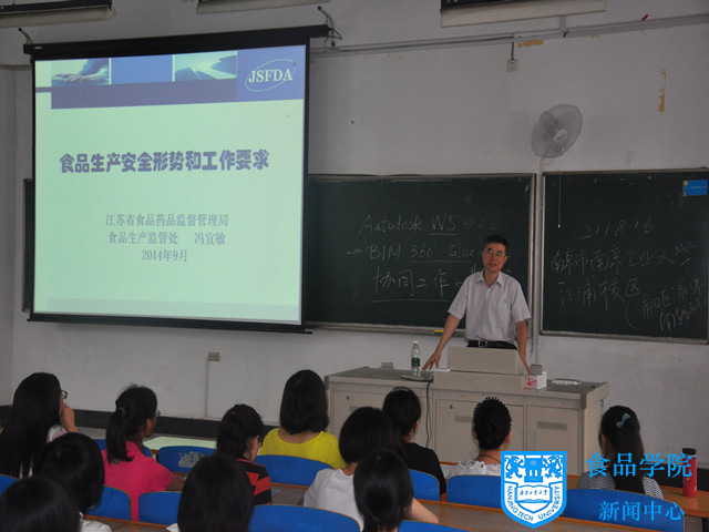 9月2日下午三点半,江苏省食品药品监督管理局食品生产监管处处长冯宜敏应美高梅mgm1888公司官网邀请来我校厚学400进行食品方面的讲学。院党委书记熊晓辉教授、党委副书记陈晓晔及新生辅导员王浩也出席本次讲座。