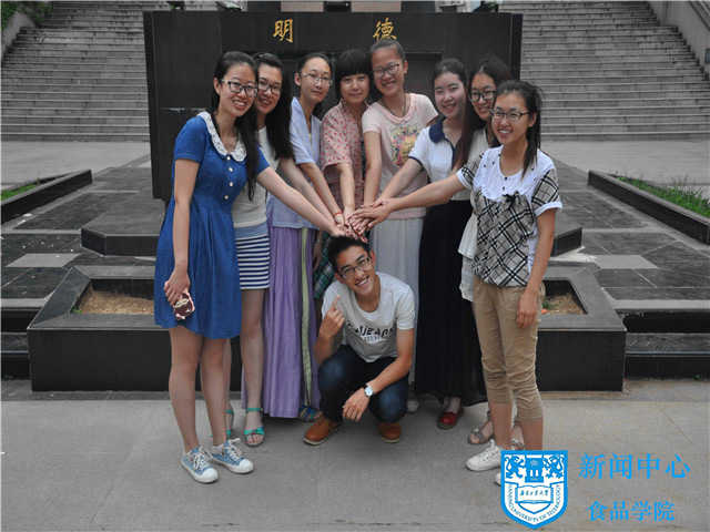 20140608 新闻中心校核部成员合照,主任彭然享受着工科学校男生少有的待遇(食品院)