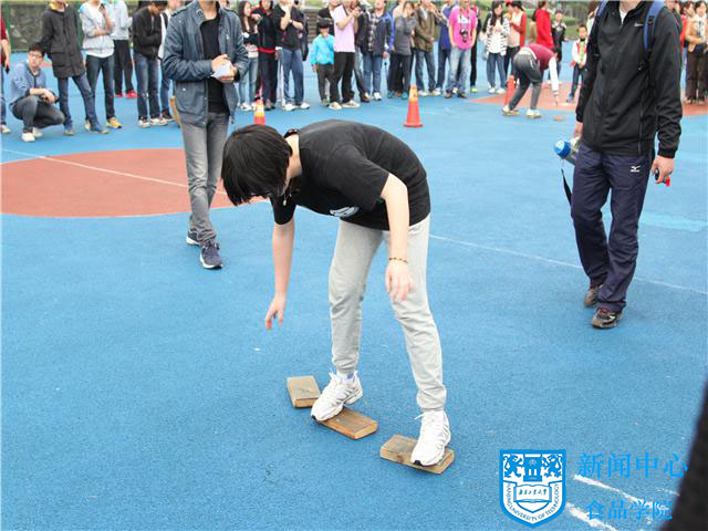 20140426 校运会摸石头过河比赛-- 踩着脚下两块小小的板,凭着顽强拼搏的毅力,她自信地向胜利的终点走去(食品院)