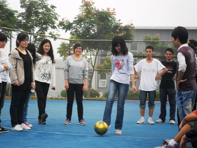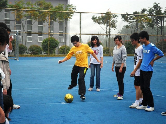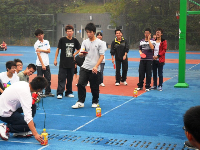 这次活动,全班分为5组,每组6人。首先进行的是拔河比赛,这不仅是一场力量的比拼,更是一场智慧的较量,强大的力量与合理的次序安排成了胜利的关键。男生与女生都浑身解数,使得力量与智慧又一次完美的结合。其次进行的是“趣味乒乓球比赛”,这是一场技巧的比拼,根据比赛规:每位选手颠球绕行障碍物一周,并进行接力,用时最少的一组获胜。在哨声响起的那一刻,各路高手纷纷登场,有悠闲自若,闲庭信步的,让人暗叹佩服;有踉踉跄跄,东倒西歪的,让人忍俊不禁。最后进行的是“百发百中“的足球比赛,每人有三次定点射门机会,射中次数最多的一组获胜,在这场激烈的碰撞中,女生展现了惊人的球技,飒爽英姿,让我们再次明悟巾帛不让须眉。