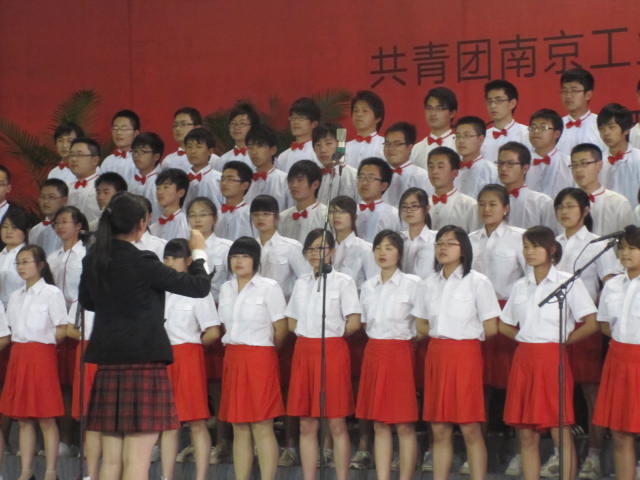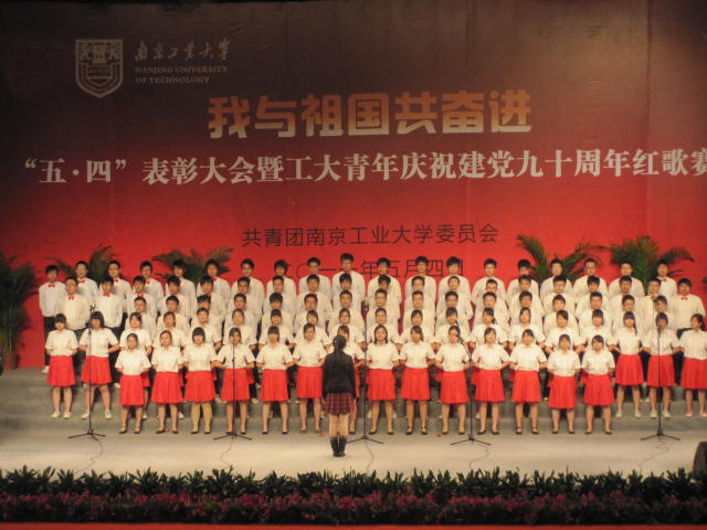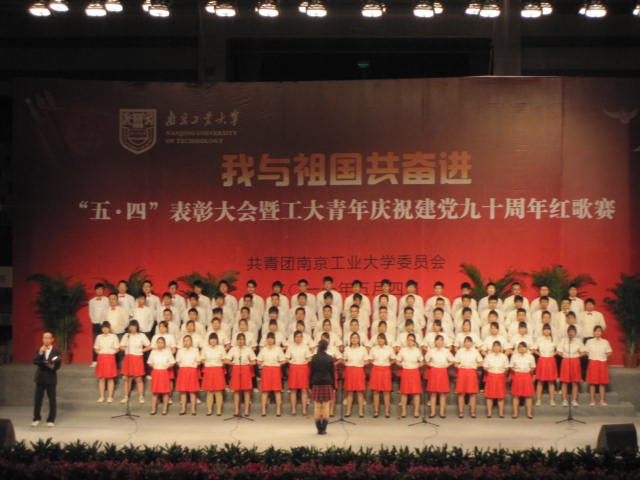 激情五月,放飞青春。五月四日傍晚,由共青团南京工业大学委员会主办的“我与祖国共奋进”,2011年五四表彰大会暨工大青年庆祝建党九十周年红歌赛在体育馆隆重举行。校党委书记王德明教授、校党委副书记、副校长高明、纪委书记崔益虎、副校长张进明及各部门、各学院负责人出席表彰大会,江苏省教育厅体卫艺处副处长刘扬生、南京艺术学院音乐教育系主任叶继红、南京航空航天大学大学生文化艺术指导委员会秘书长杨莉莉、南京师范大学音乐学院教授江铃、江苏教育学院音乐系教授王庆、我校大学生艺术教研室主任潘亭亭应邀出席比赛并担任红歌赛评委。