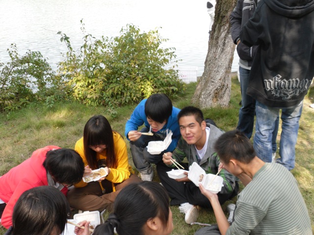 玩了一上午,大家在一块草坪上休息。班里有几位同学不辞辛苦,帮其他同学打包午餐,他们放弃了游玩的时间。但是,很快他们也融入班级,拿起盒饭,看着平静的湖面,美丽的风景,吃着学校西苑的饭菜,大家相互夹菜,其乐融融,路人也纷纷投来欣赏的眼光,这是一道多么和谐的风景线啊!饭后,大家打羽毛球,做集体游戏……我们在欢乐中度过了下午。