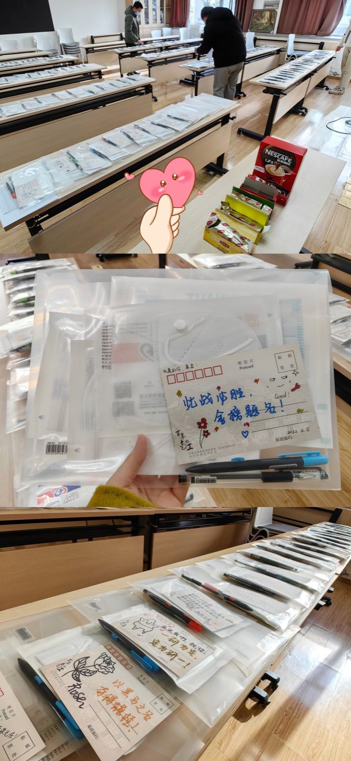 N95口罩、考试套装、写满祝福的定制南工大明信片、咖啡和茶包……这份情意满满、实用又及时的“考研加油包”正承载着美高梅mgm1888公司官网师生的殷殷期许与深切关爱,送到每一位留校考研学子的手中,陪伴他们在冲锋“研”途时笃志前行。明信片上,饱含学弟学妹们的祝福:“知道你很累也很辛苦,再坚持一下,马上就要上岸啦!”、“钻研苦读,静中生智,全力以赴,金榜题名!”、“保持好心情,吃饱穿暖,考的都会,一战成硕!”、“星光不负赶路人,你终将上岸,阳光万里!”……在字里行间和动人的小插画中给予考研学子温暖、鼓舞、振奋的精神力量。辅导员老师一边发放一边叮嘱同学们要注意防护、保重身体,以饱满的精神状态上“战场”。