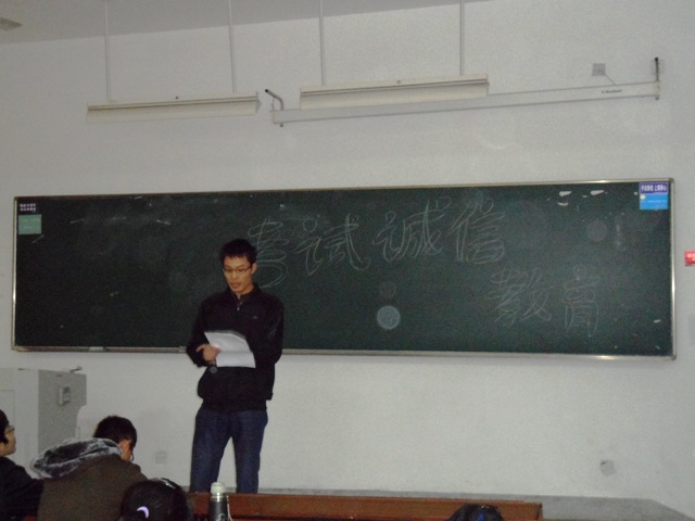 食品1101班班长余承启简短地介绍了此次班会的主题,强调了建设优良的班风与学风对班级建设的重要性,并就本班近期的具体情况一一作了通报。班级是一个整体,班委犹如钢筋,与其他每位同学一起构筑着班级这座大厦。众人拾柴火焰高,由班级委员带头,才能更好地发挥榜样、引领作用。接着同学们对于学习、生活等各方面情况各抒己见。学习委员汇报了课堂缺席、作业上交的情况;生活委员肯定了大家在宿舍卫生与安全、纪律方面的成绩;组织委员回顾了第一次班级活动“珍珠泉之秋”的欢声笑语……有缘千里来相会,食品1101这个温暖的集体回想起自相识以来的点点滴滴,纷纷表达了对争创先进班级的美好心愿。没有规矩不成方圆,班集体也是如此。为了规范班级同学们的日常学习与生活,针对课堂、教室、宿舍等重点公共空间的常规检查和秩序管理必不可少。文艺委员以ppt的形式讲述了历代名人关于诚信的小故事,启发了大家的思考——在这个以诚信缺失为灰色背景的时代我们应何去何从?并且布置了一项小任务——诚信承诺书。大学生生活在一个自由的国度,浓郁的学术氛围是否能够战胜内心的惰性?天性中的诚信是否可以抵御邪恶的侥幸?一份诚信承诺书犹如一个高贵的灵魂,昭示着人性的美德。