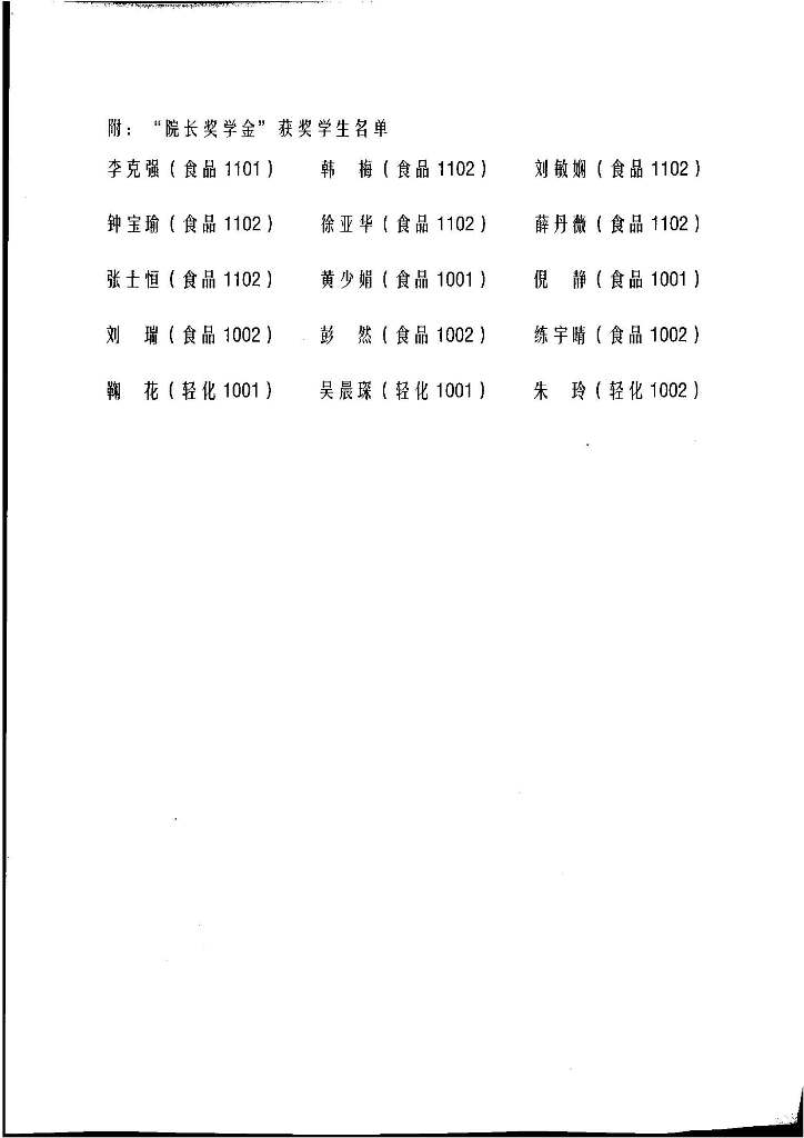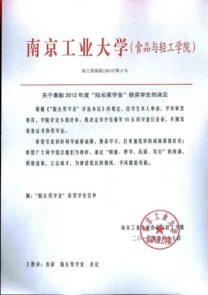 关于表彰2012年度“院长奖学金”获奖学生的决定