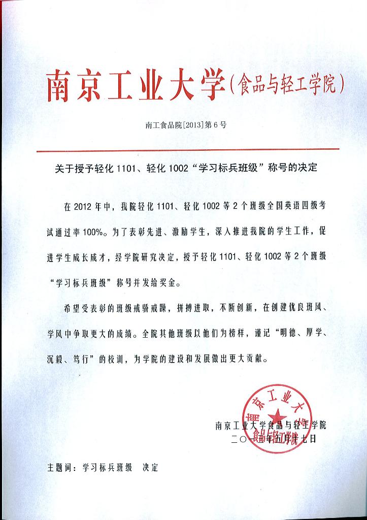 关于授予轻化1101、轻化1002“学习标兵班级”称号的决定