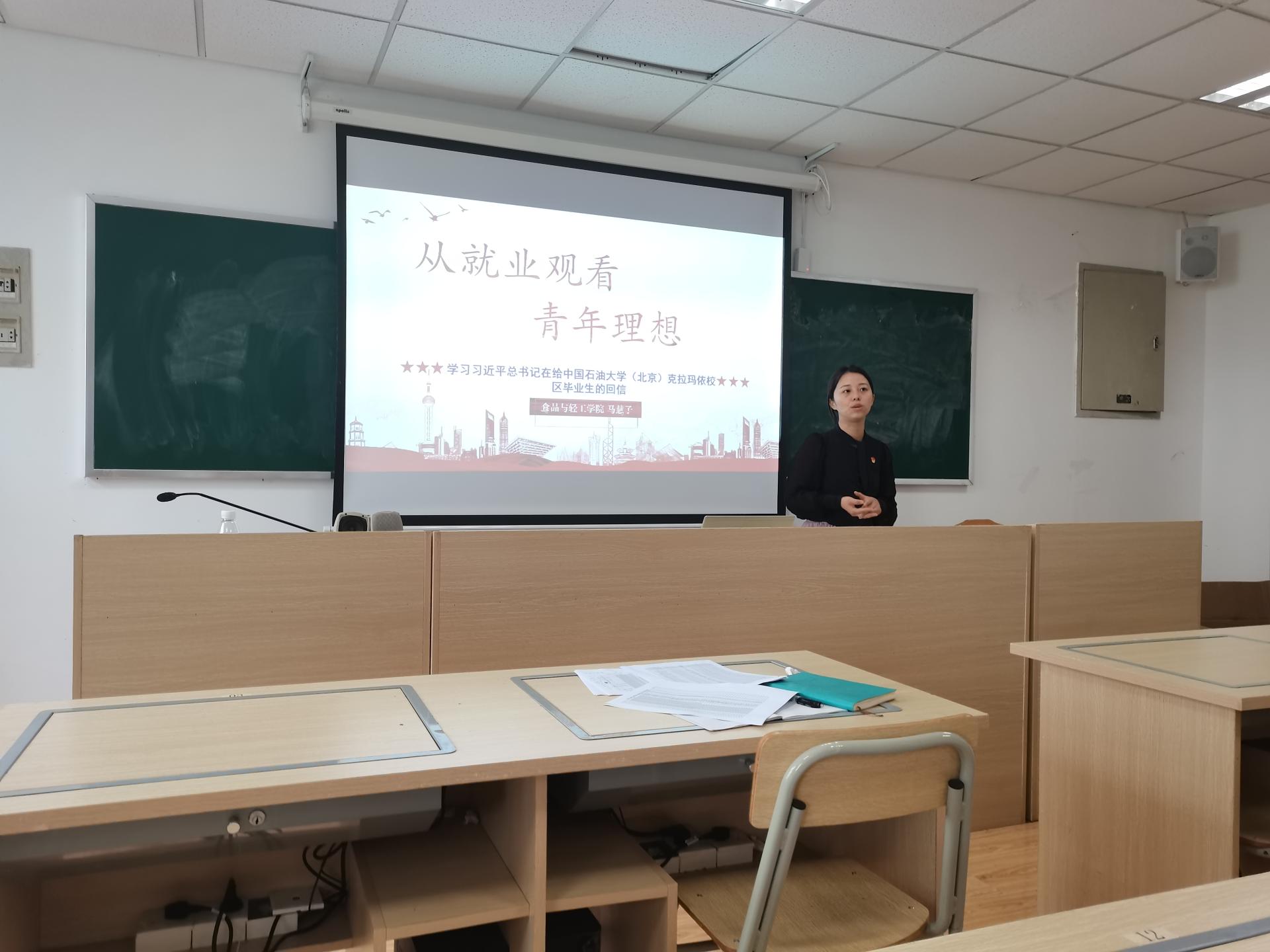 辅导员马慧子领学了习近平总书记给中国石油大学(北京)克拉玛依校区毕业生的回信。马慧子老师就自己切身经历,告诉同学们要关注时事政治,将自己专业所学应用到国家需要的行业里去,为祖国的建设贡献出一份力量。最后,马慧子老师讲述了我校优秀校友陆建新和“杂交水稻之父”袁隆平老先生的故事,鼓励美高梅mgm1888公司官网学子学习他们将专业所学融入个人理想和国家事业。