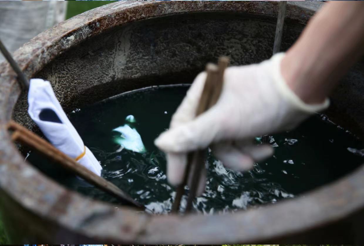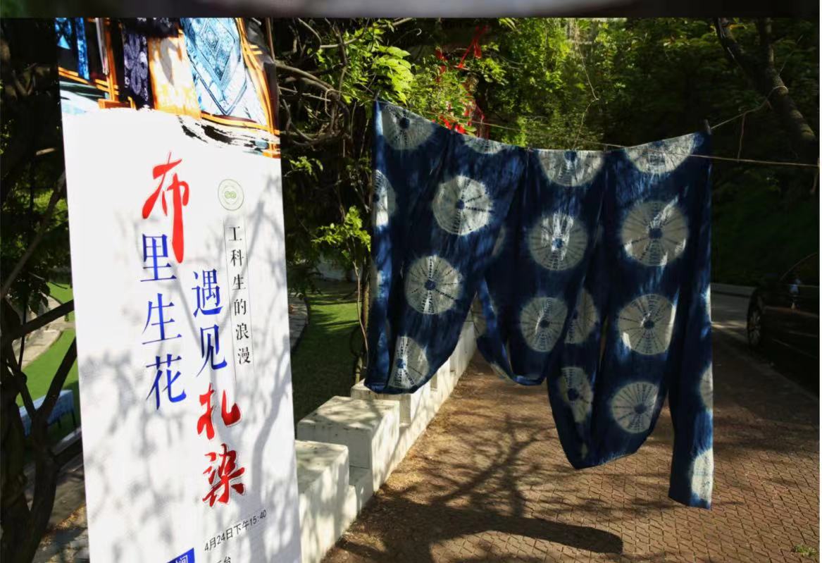 活动现场分为扎染体验、手工制作、作品赏析、公益拍卖四个环节。轻化工程专业的毕业生、学生党员担任小老师指导所有参与的本科生开展蓝染扎染、草木热然、植物拓染等活动,体验植物天然色素在布料中的反应和变化,学习中国传统文化中的智慧。劳动实践课的任课教师郑春玲、马慧子老师从专业的角度进一步对还原、助染等工艺和文化传承发展历程做了详细的介绍,让同学们在扎染体验中感受工科生“布里生花”的浪漫。